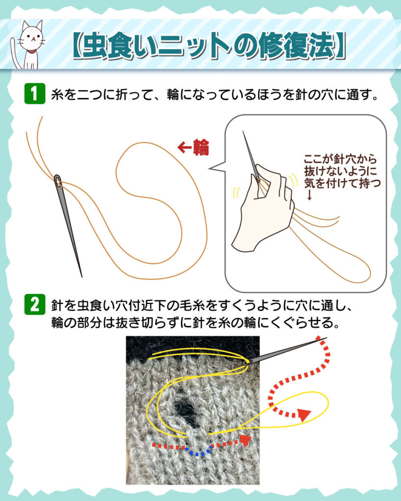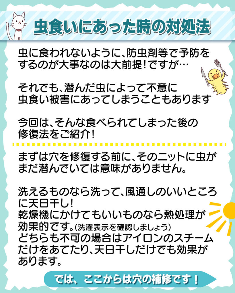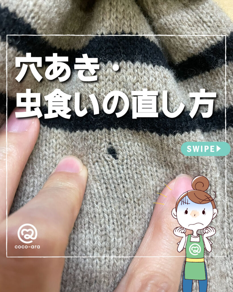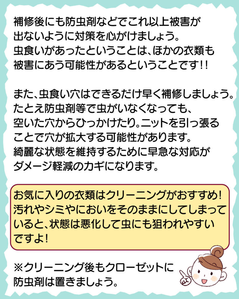 たとえ防虫剤等で虫がいなくなっても、空いた穴からひっかけたり。ニットを引っ張ることで穴が拡大する可能性があります。