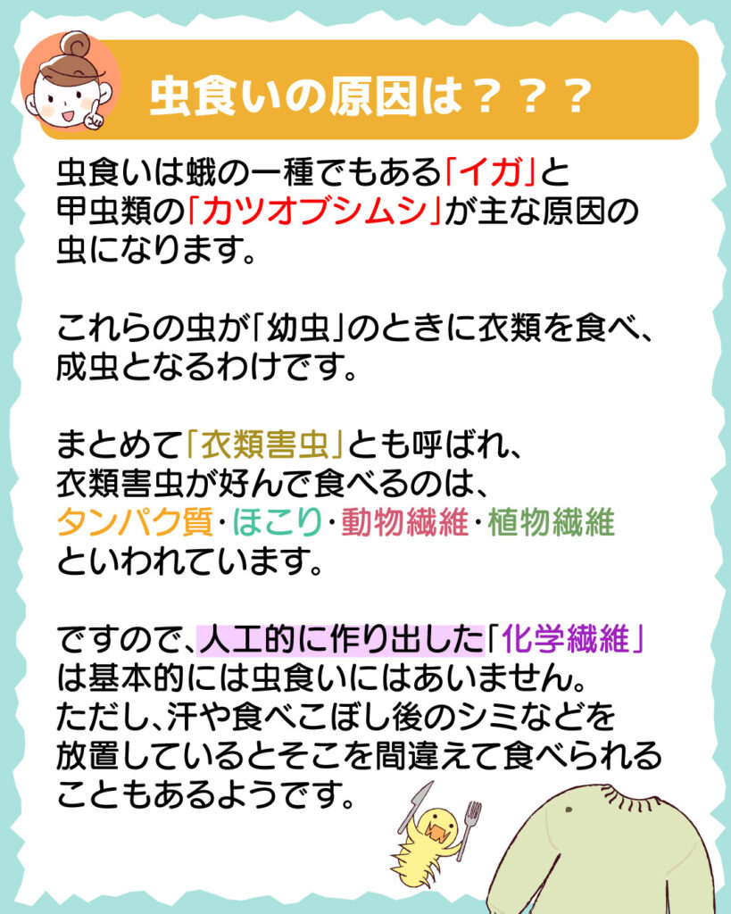 ですので、人工的に作り出した「化学繊維」は基本的には虫食いにはあいません。