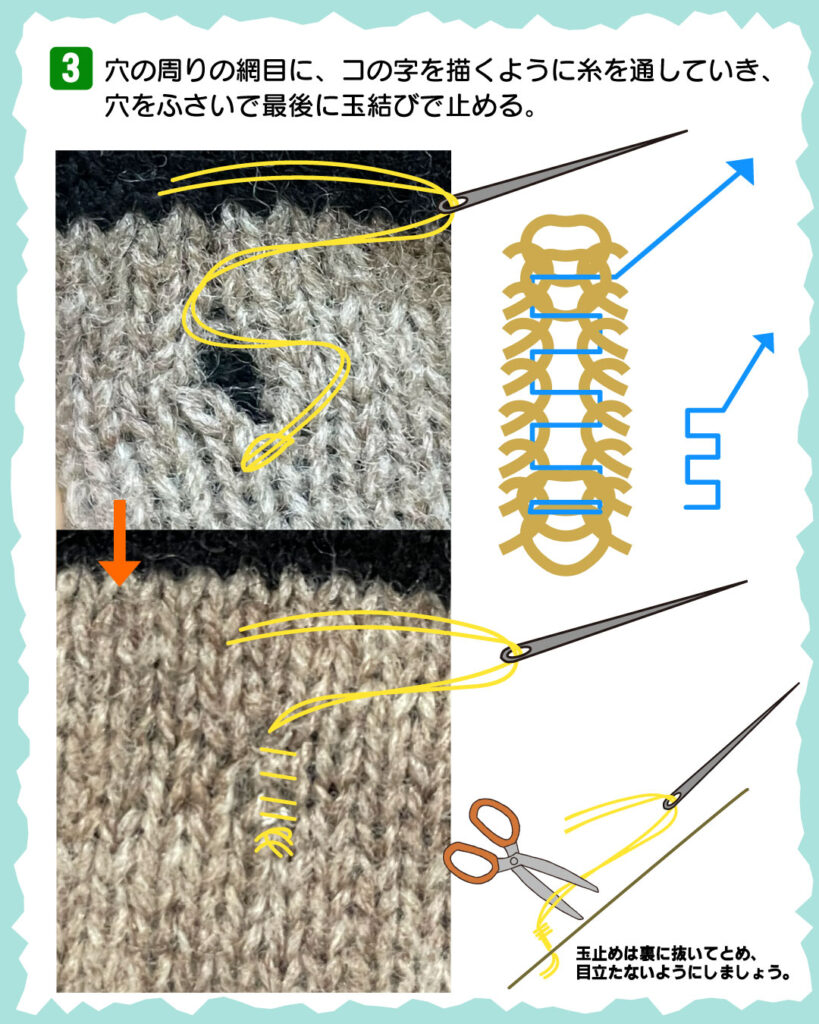 3⃣穴の周りの網目に、コの字を描くように糸を通していき、穴をふさいで最後に玉結びで止める。